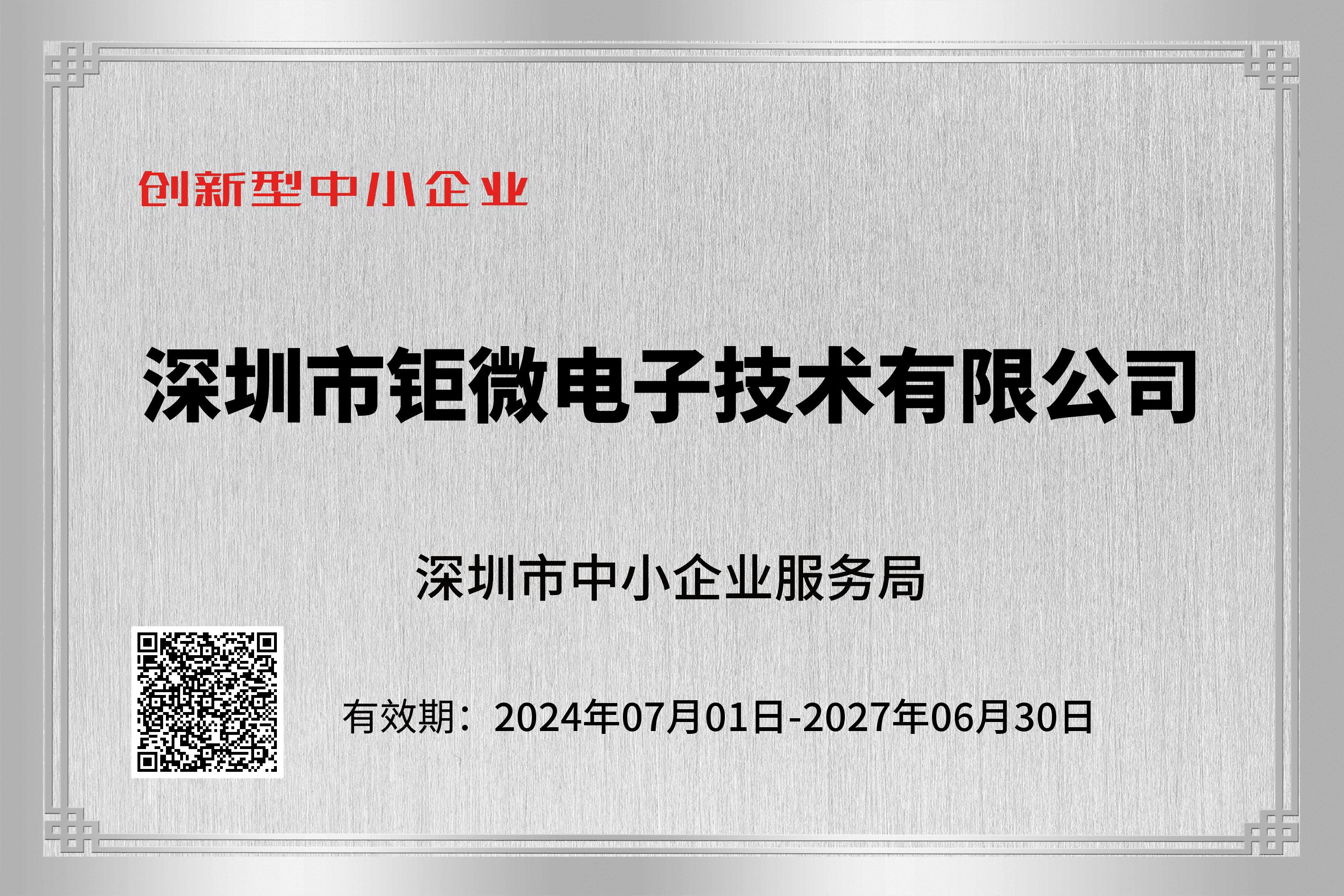 深圳市鉅微電子技術(shù)有限公司于2024年7月榮獲深圳市創(chuàng)新型中小企業(yè)資質(zhì)。