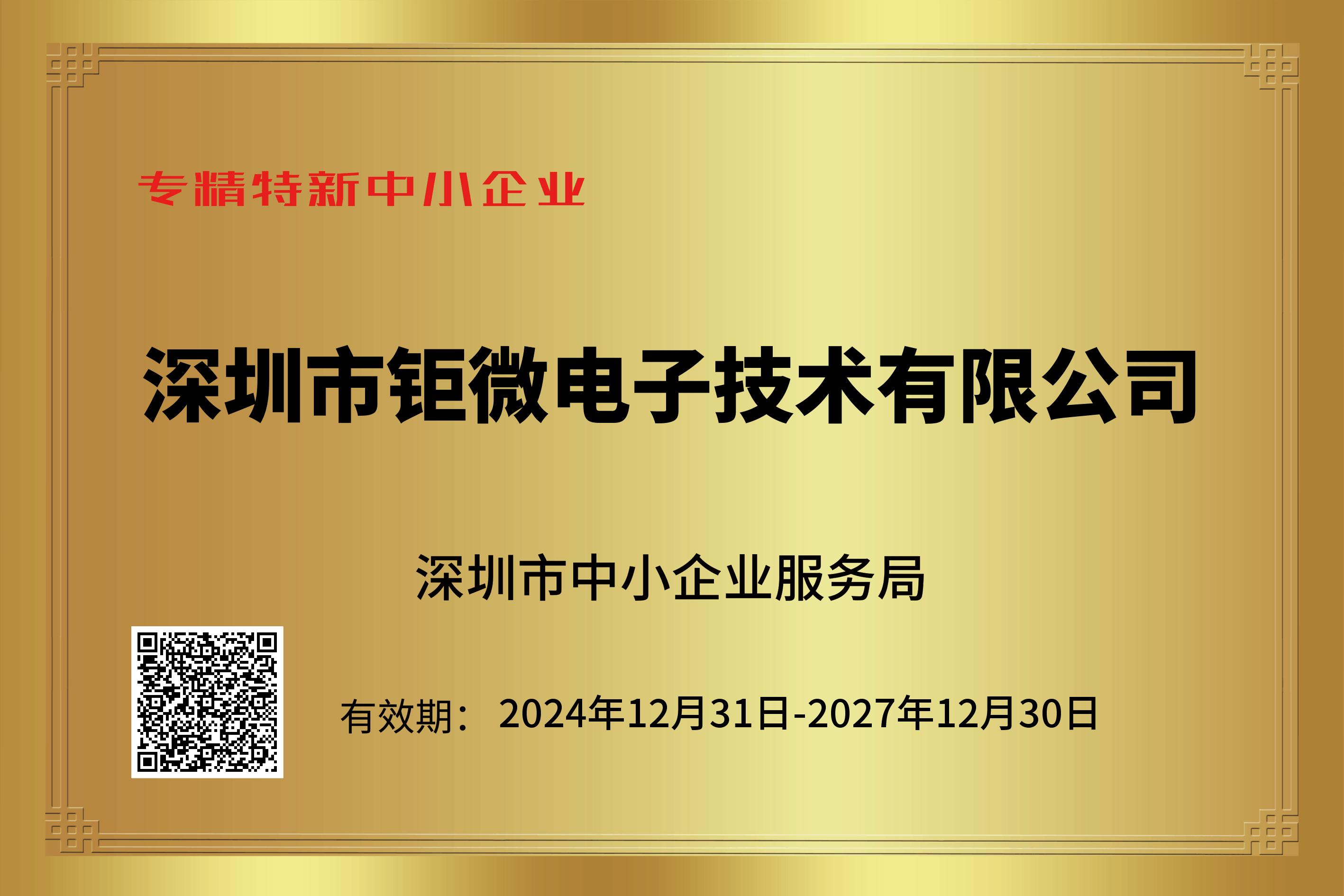 深圳市鉅微電子技術(shù)有限公司于2024年12月榮獲深圳市專精特新中小企業(yè)資質(zhì)。